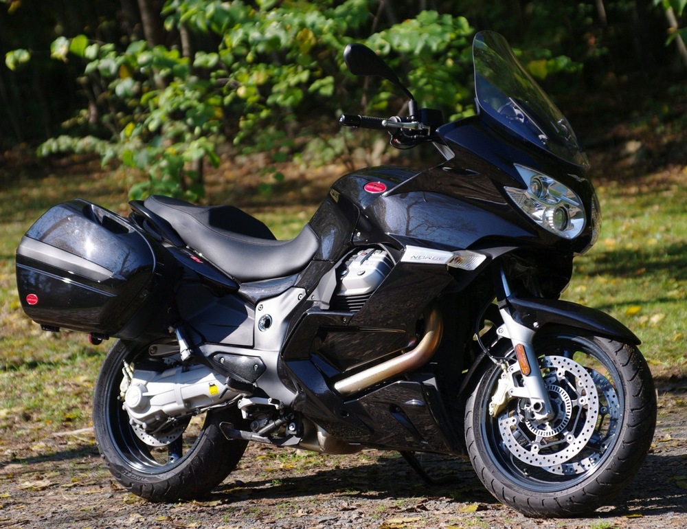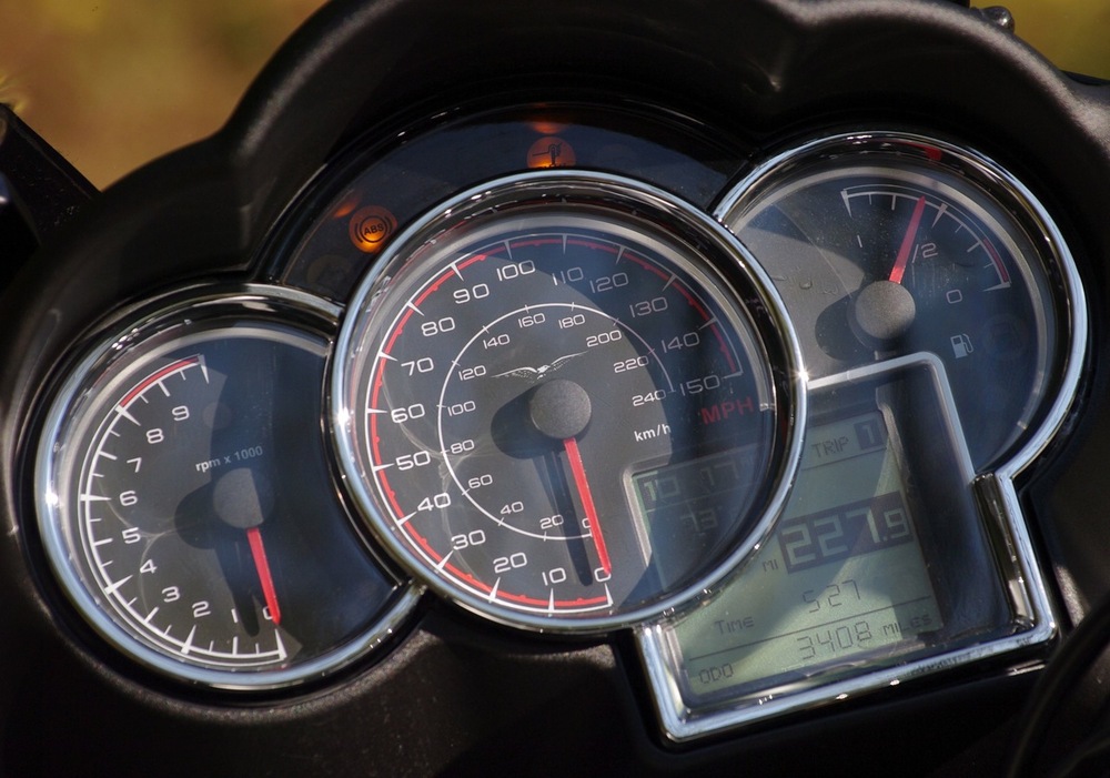 The 2014 iteration has the largest production air-cooled V-Twin motorcycle engine to ever come out of Europe, and displaces a sizable 1380cc. The design is classic, but inside we have contemporary fuel injection with a choice of three rider-selectable maps (Touring, Fast and Wet) to fine-tune performance. The big mill has gobs of low-end torque and is commendably smooth at speed considering there are two huge transverse-mounted pistons wailing away just in front of your knees. Credit an “elastic-kinematic supports system” that allows the engine to shake without passing excessive vibes on to you or your passenger. The six-speed gearbox has well-selected ratios so the big bike can always use the power most effectively, and the shaft final drive gets Guzzi’s latest cardan drive engineering to eliminate undo shaft-jacking if you’re clumsy (and loutish) with your throttle inputs. Oh, and if you are still determined to be clumsy (and loutish) with your right wrist, a 3-level Traction Control system is on board to help keep the sizable 200-series rear tire from breaking loose without your say-so.